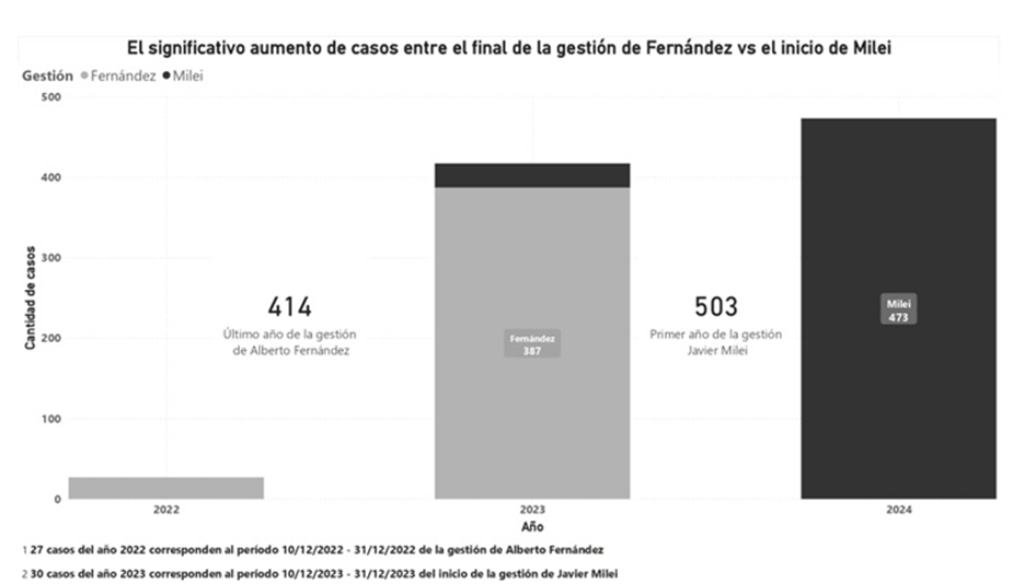 A cuatro días de asumir, el gobierno libertario comenzó a decretar represiones para quienes manifiesten. El mal llamado “protocolo antipiquetes” ordena a las Fuerzas Policiales y de Seguridad Federales intervenir frente a cortes de vías de circulación, identificar “líderes e instigadores” y relevar esos datos al ministerio de seguridad, criminalizando así la protesta social. En esas mismas primeras semanas se habilitaba el uso de la línea 134 para denunciar a dirigentes sociales que convocasen a manifestar a beneficiarios de planes sociales. “Esta línea, además de buscar generar temor social, fue utilizada para iniciar distintos tipos de causas penales, nuevos allanamientos a movimientos sociales. Sobre todo esto ocurrió en el año 2024”, recordó Frankel. Tal como recuerda la investigadora de la CTAA, se anunciaba aquello de “el que corta no cobra, incluso amenazando a las compañeras que iban con sus hijos o sus hijas, que les iban a quitar la tenencia”.