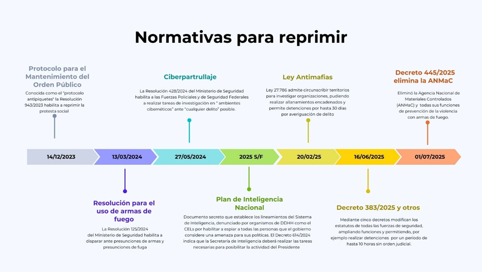 Entre todas las normativas que se impusieron sobre el accionar de las fuerzas de seguridad para coartar la organización popular hay una que pasó por la aprobación del Congreso y que las especialistas remarcar entre las más peligrosas: La Ley 27.786 para la investigación y sanción de organizaciones criminales, dada a conocer como “Ley Antimafias”. “Es una ley contra las organizaciones sociales y la protesta”, dijo Verdú. Según detalló Sabina Frederic: “Crea zonas de excepción, habilita la consideración de una organización sindical, política o social como una organización criminal, permite allanamientos en cadenas sin orden judicial, escuchas telefónicas sin orden judicial, detenciones por hasta 30 días por averiguación de delito. Todo eso es gravísimo”.