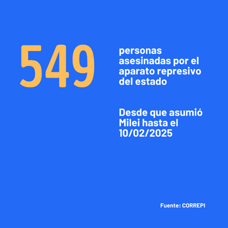 En los primeros 14 meses de gestión de Milei desde CORREPI (Coordinadora contra la Represión Policial e Institucional) registraron 549 personas asesinadas por el aparato represivo del Estado y advierten que estamos ante la gestión más letal de las últimas tres. Por su parte, el Monitor de Respuestas Represivas Estatales o para estatales a la Protesta Social en la Argentina que se está haciendo desde el Instituto de Estudios y Formación de la CTA Autónoma, (la Central de Trabajadores de la Argentina) registró desde el 10 de diciembre de 2023 hasta el 31 de agosto de 2025: 88 represiones estatales a la protesta social, 2534 heridos en esos contextos, 461 detenidos y 96 allanamientos a organizaciones sociales. Además, “al menos 3 infancias fueron gaseadas por las fuerzas de seguridad, compañeros y compañeras de prensa fueron agredidos y atropellados, a otros se les intentó destruir sus herramientas de trabajo. Y también hay al menos cuatro compañeros que perdieron sus ojos por operativos policiales”, contó Jimena Frankel, Socióloga y coordinadora del Monitor.